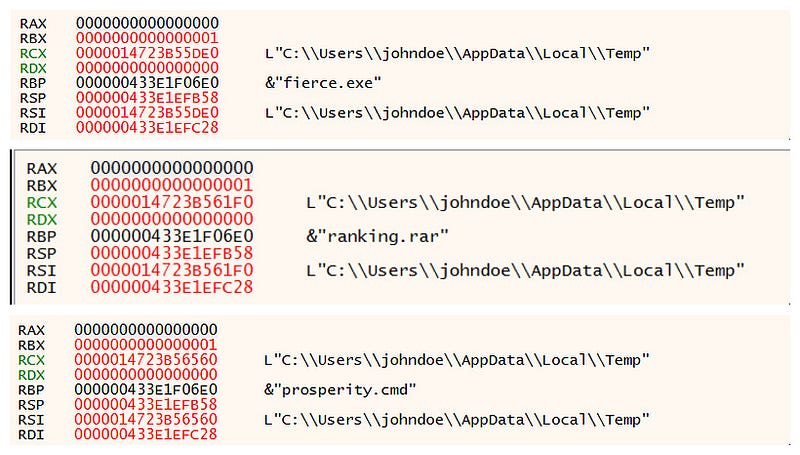 - The first subroutine fo_rm_at uses fierce.exe from the system’s temporary directory to extract a file named ranking.rar into the user’s Links folder, using the password stored in %horn%.